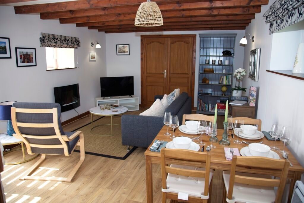 The open-plan living room features a modern electric fire and a 42” flatscreen television. Complimentary WiFi is provided, along with a selection of books and games for your enjoyment. Patio doors offer access to the terrace and garden areas. Rest assured, safety is a top priority: the gite is fitted with smoke alarms, fire extinguishers, and a fire blanket.